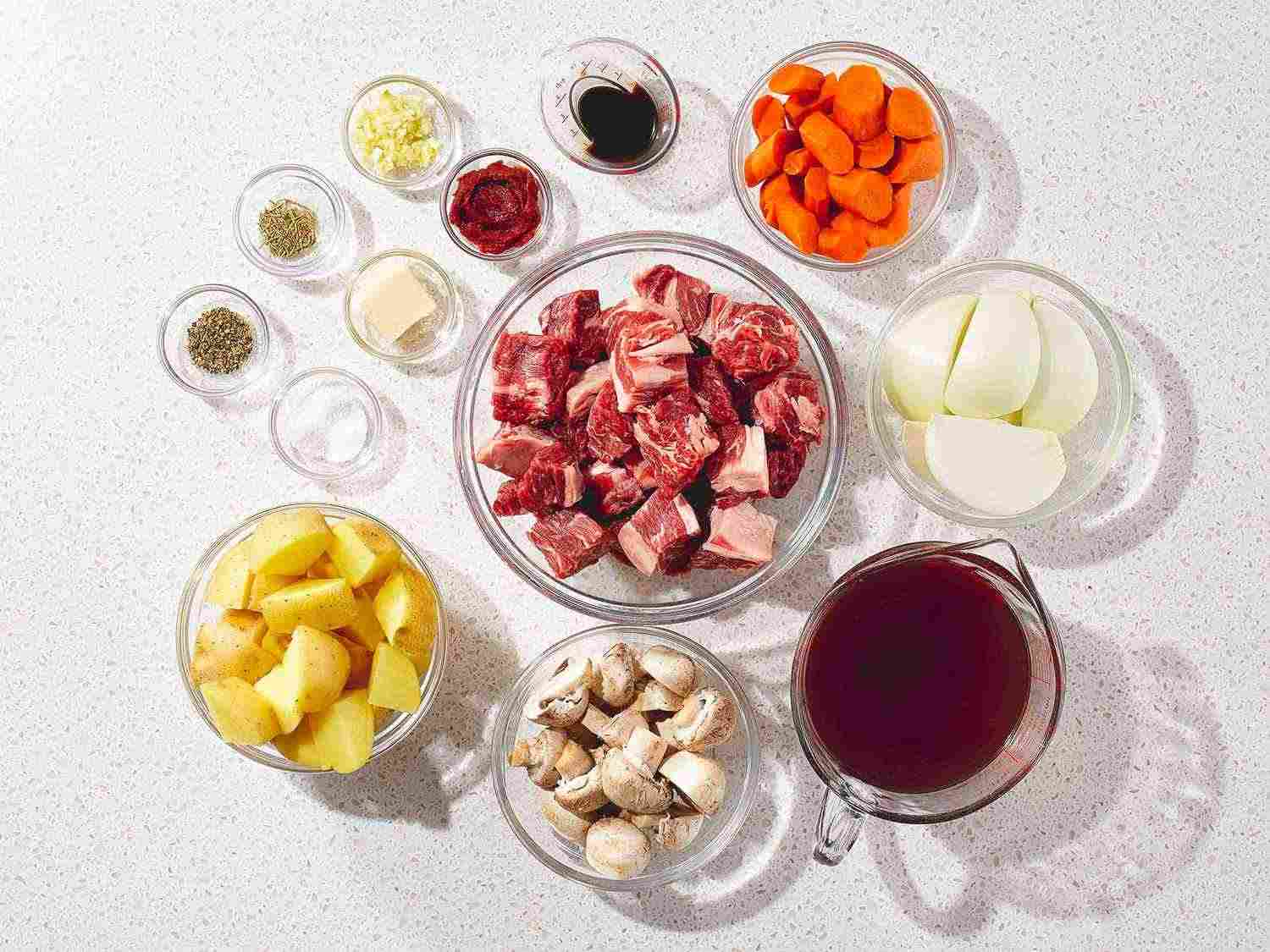 - Step 3:Return all beef chuck cubes to the pot. Add potatoes, mushrooms, onion, carrots, and garlic; cover with beef broth. Stir in Worcestershire sauce, tomato paste, salt, pepper, and rosemary. Dotdash Meredith Food Studios